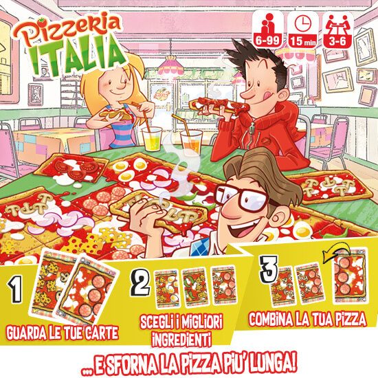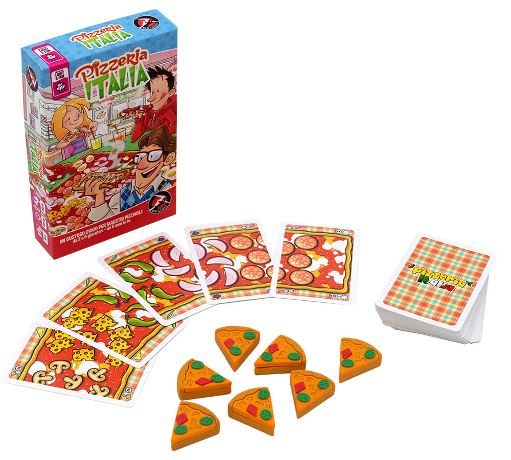 “Pizzeria Italia” è un gioco avvincente e strategico. Durante la preparazione creerete il vostro mazzo accumulando le carte Trancio. Poi tenterete di comporre la vostra pizza al metro il più velocemente possibile. Chi comporrà la pizza più prelibata nel minor tempo?