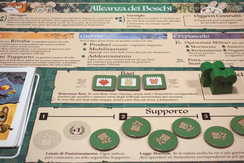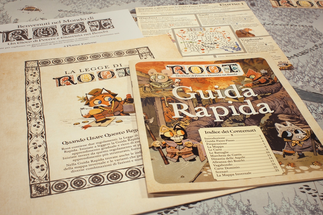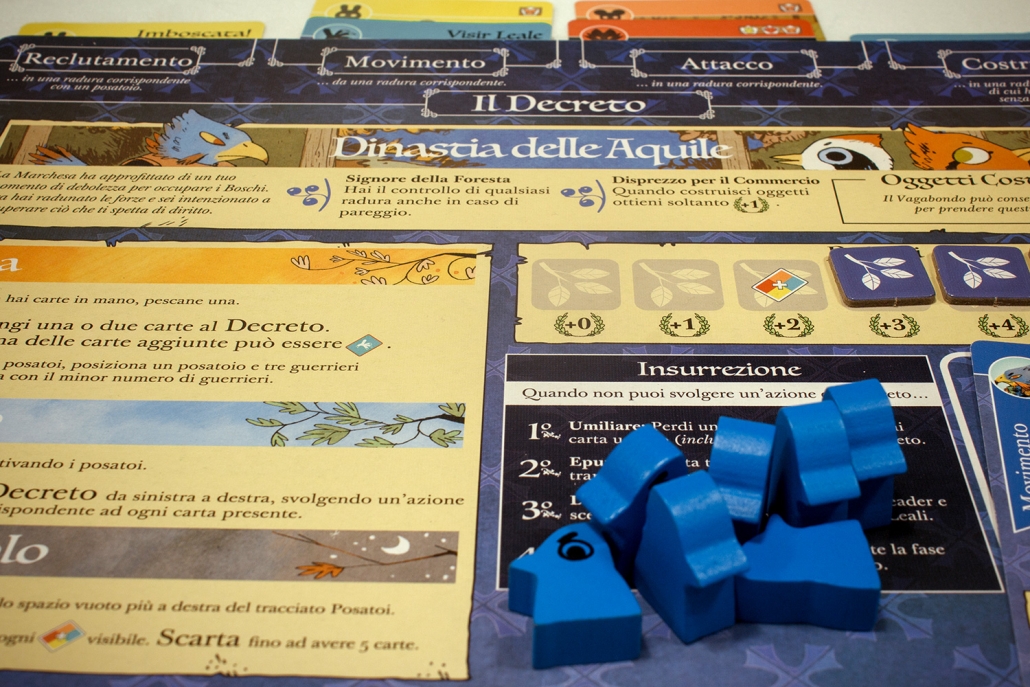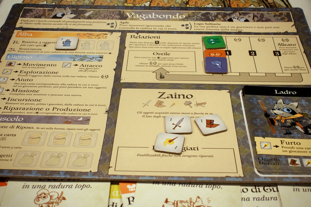 Contenuto: 2 Dadi, 54 carte mazzo condiviso, 16 Carte Riassunto, 15 Carte Missione (Vagabondo), 3 Carte Personaggio (Vagabondo), 4 carte passo-passo, 4 Carte Leader delle Aquile, 2 Carte Visir delle Aquile, 3 Indicatori Relazione (Vagabondo), 4 Indicatori di Punteggio, 12 Indicatori di Simbolo, 4 Tessere Rovina, 1 Pedina Vagabondo, 25 Guerrieri della Marchesa, 20 Guerrieri delle Aquile, 10 Guerrieri dell’Alleanza, 6 Segherie della Marchesa, 6 Officine della Marchesa, 6 Centri di Reclutamento della Marchesa, 7 Posatoi delle Aquile, 3 Basi dell’Alleanza, 8 Segnalini Legna della Marchesa, 1 Fortezza della Marchesa, 10 Segnalini Supporto dell’Alleanza, 7 Oggetti “I” (Iniziali), 4 Oggetti “R” (Rovine), 12 Oggetti non contrassegnati.